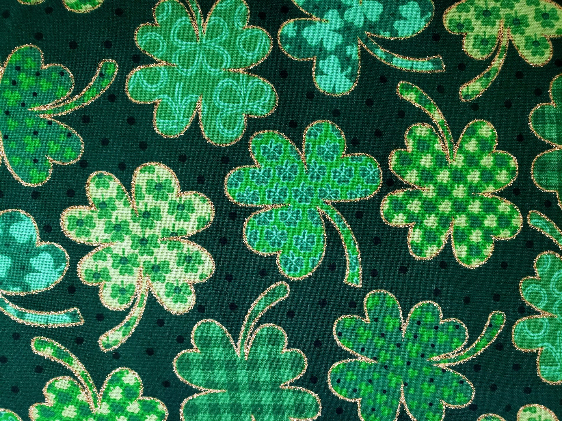 This clip on dog bandana with a buckle from The Fab Furballs features a sparkly St. Patrick's Day design of large green shamrocks in different patterns with gold accents on a dotted green background.