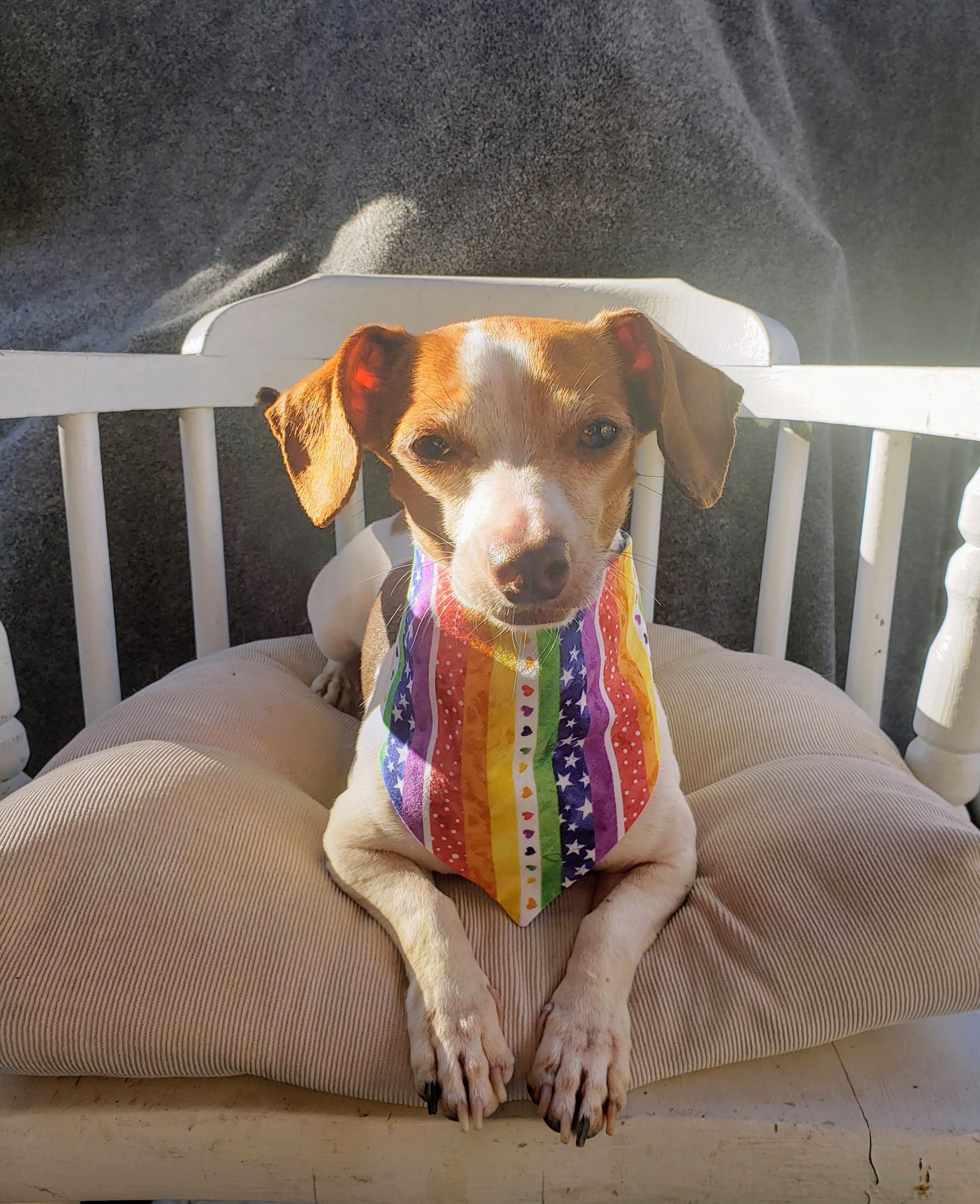 This clip on dog bandana with a buckle from The Fab Furballs features a rainbow palette with stars and hearts. This can be for anyone who loves color & identifies with the rainbow pattern!