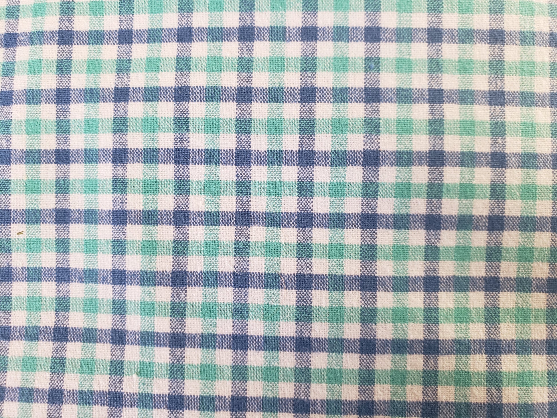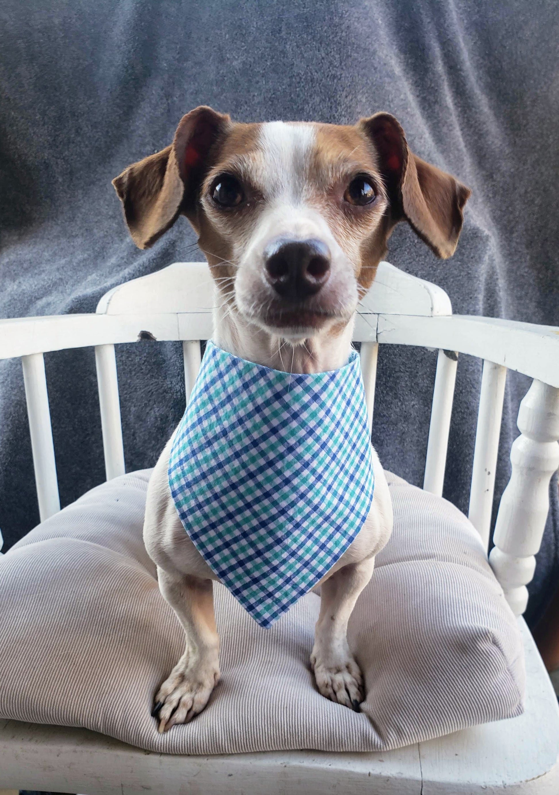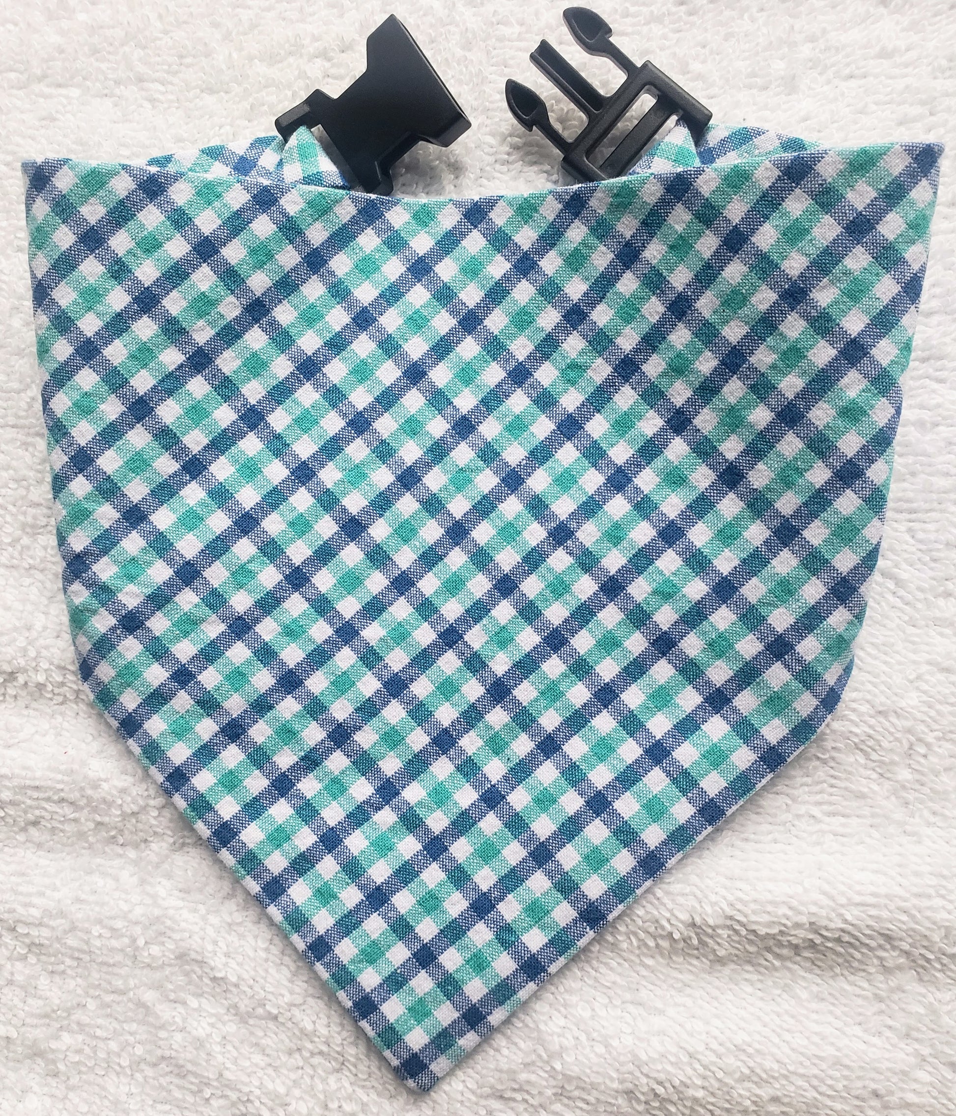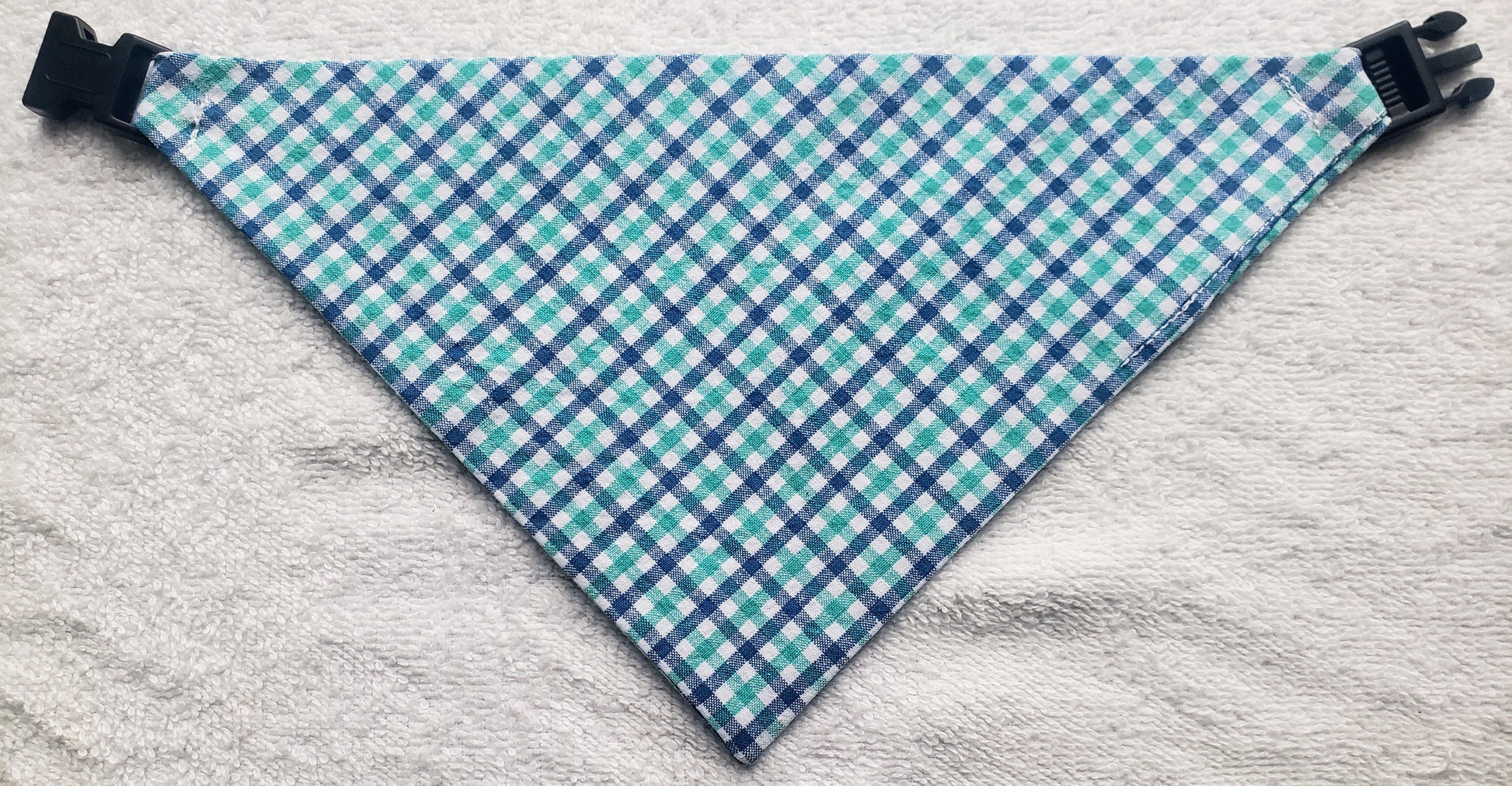 This clip on dog bandana with a buckle from The Fab Furballs features a fresh, tiny plaid print of teal and navy blues on a white background, perfect for summertime wear.