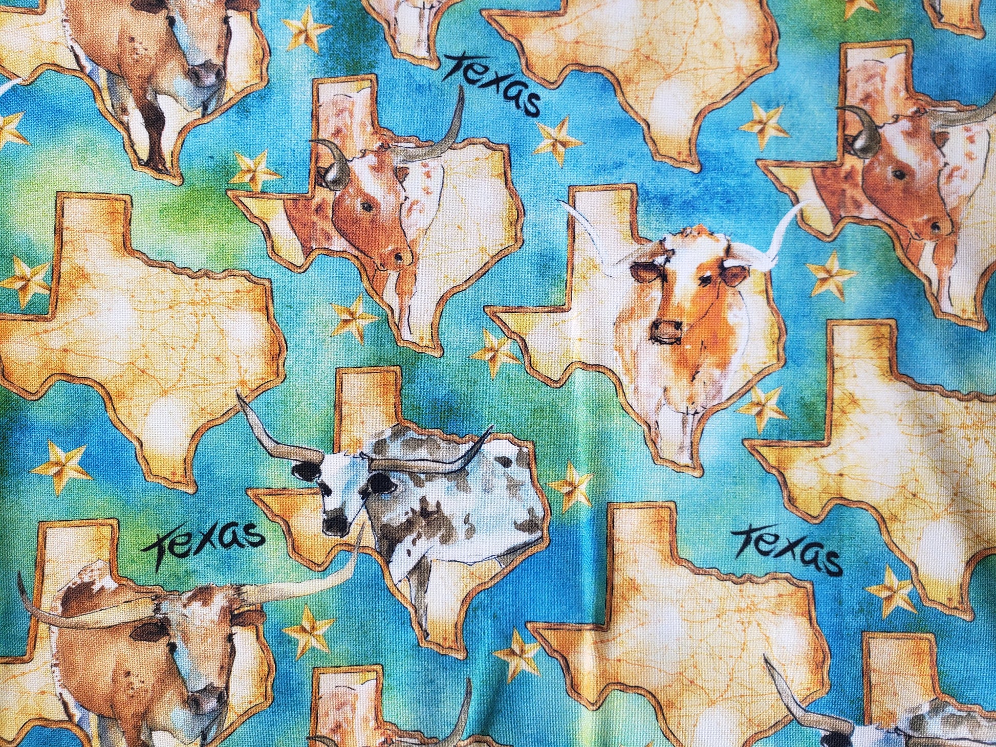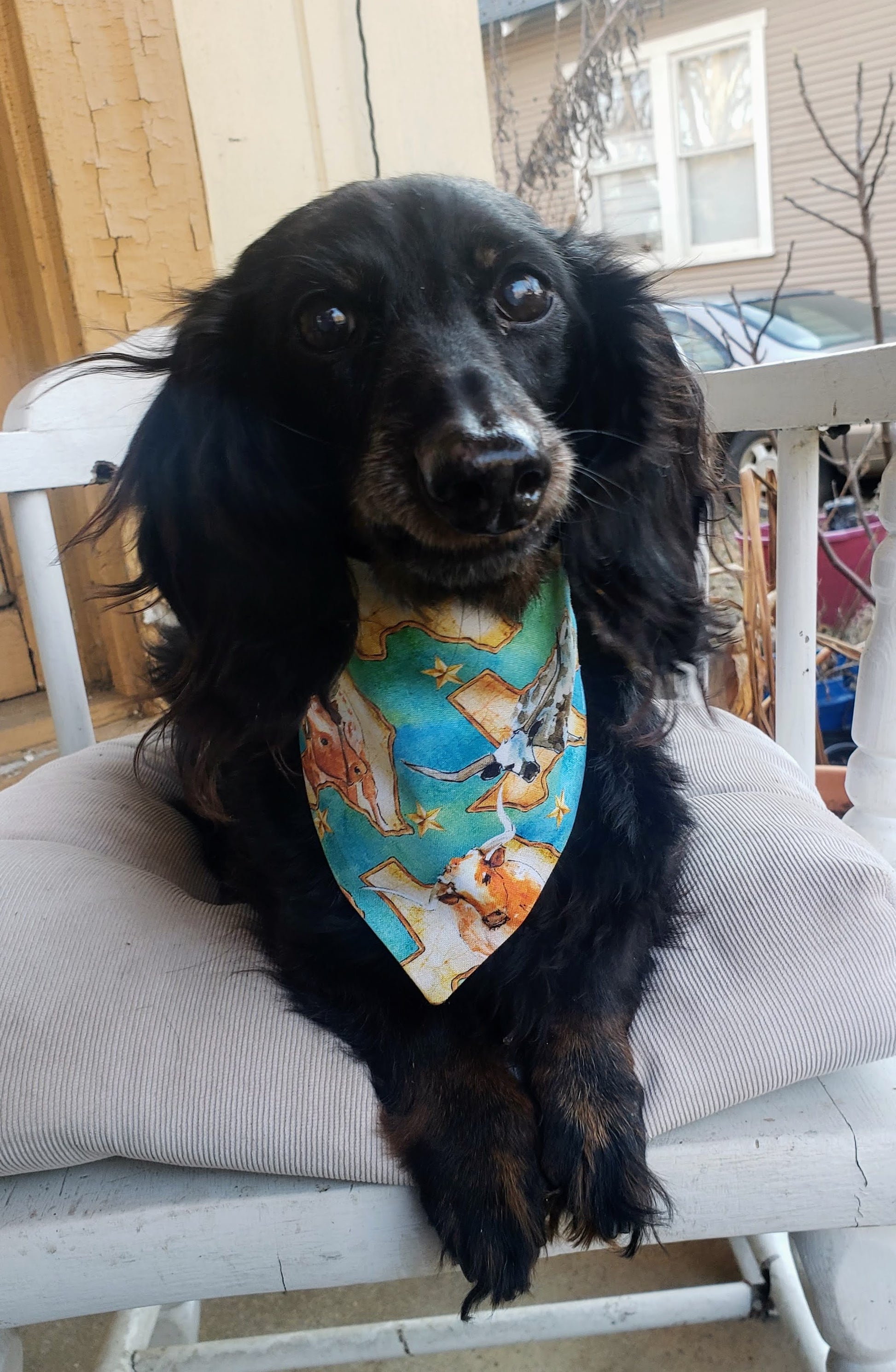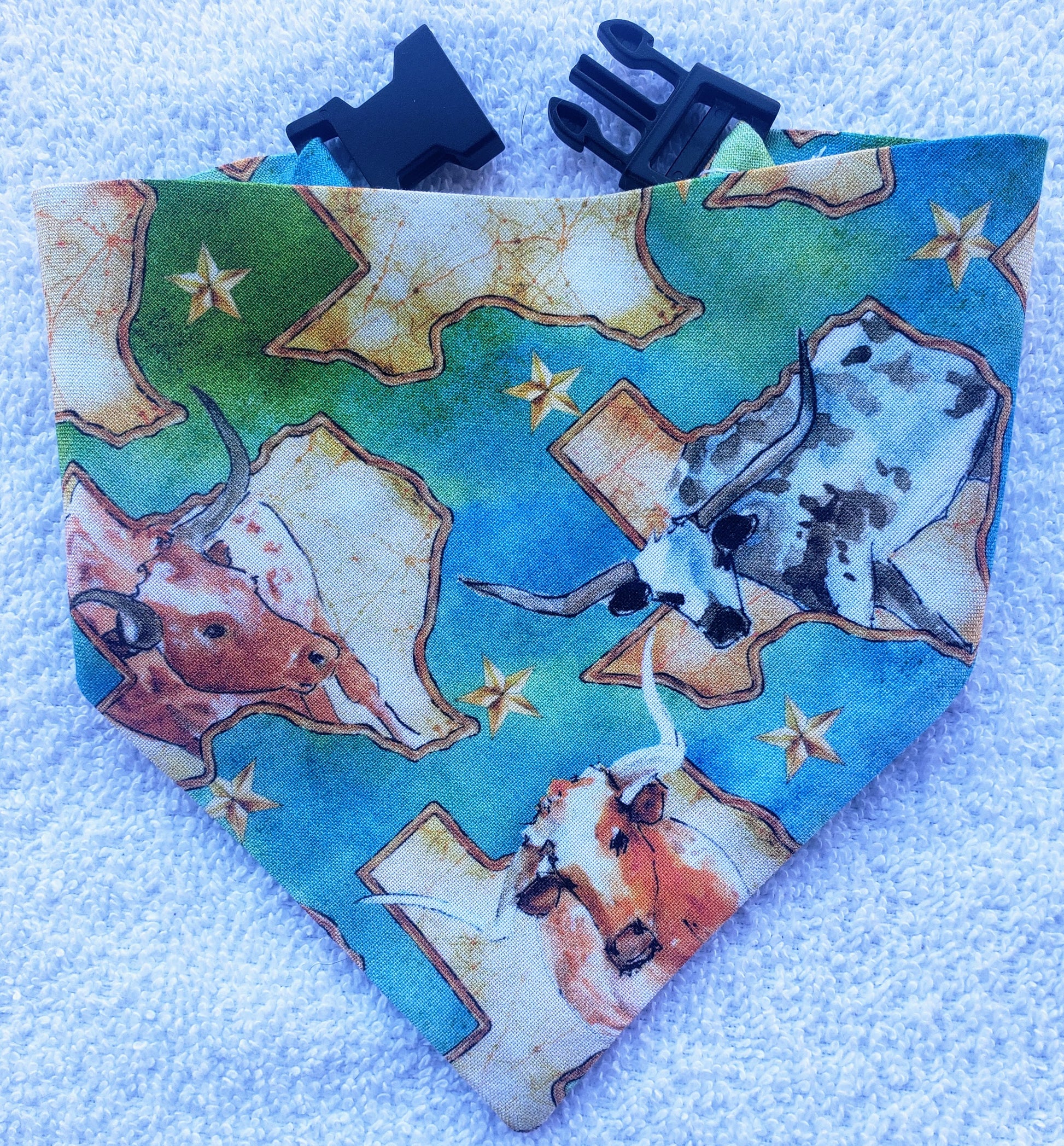 This clip on dog bandana with a buckle from The Fab Furballs features maps of the state of Texas and colorful Longhorn cattle, capturing the state pride of a Texan.